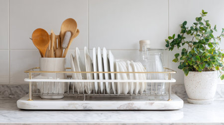A dish rack displays clean dishes alongside wooden utensils and a small potted plant on a sleek marble countertop in a contemporary kitchen.