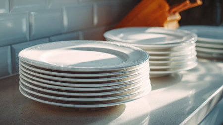 Bright natural light highlights a stack of clean white ceramic plates drying on a smooth kitchen counter after washing.