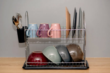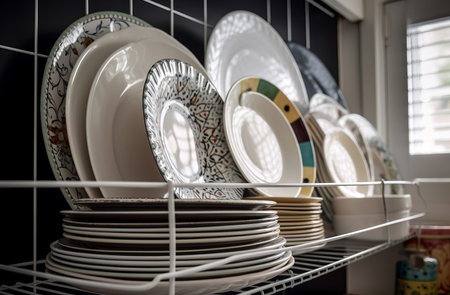 Dish drying plates clean kitchen. Dinning style porcelain object. Generate Ai