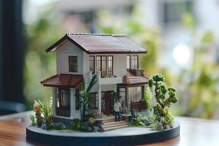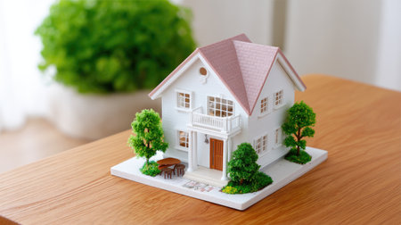 This image features a charming miniature house model surrounded by lush greenery and a wooden table, creating a cozy and inviting atmosphere.
