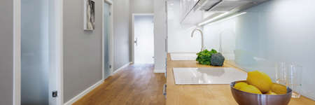 Panorama of stylish kitchen with wooden floor and countertop in gray corridor area of modern apartment