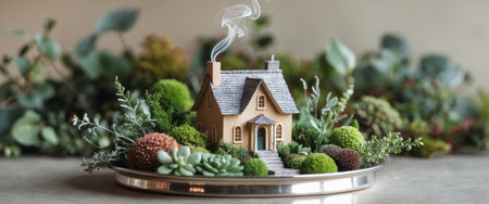 AI Generated. Miniature House on Silver Tray Surrounded by Lush Greenery and Smoke