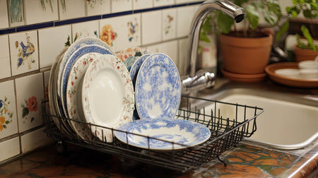 A beautiful display of vintage dishware in a drying rack next to a stainless steel sink, surrounded by decorative tiles and green plants, showcasing home comfort.