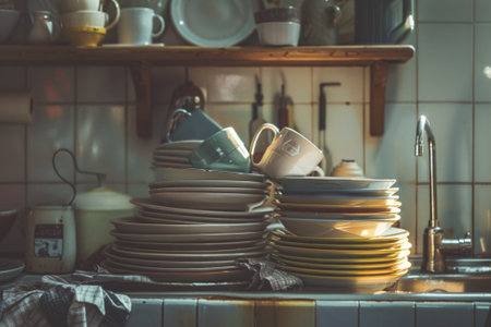 A vivid scene capturing dirty dishes soaked in soapy water, showcasing the reality of kitchen cleanup with sponges and bubbles. Perfect for household themes.