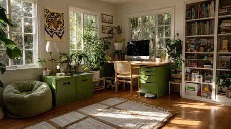 This beautifully lit home office features a vibrant green color palette, cozy furniture, and lush indoor plants, creating a serene workspace for inspiration.