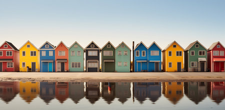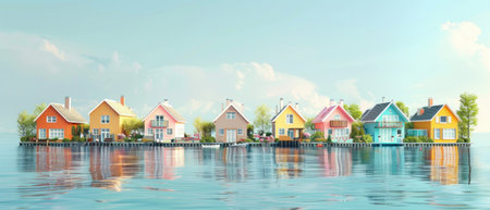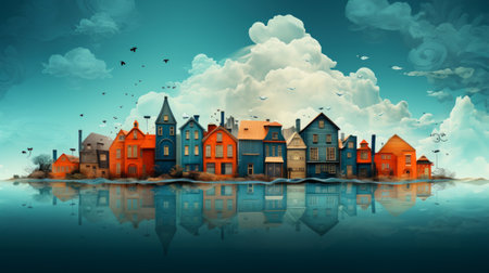 Illustraition of row of vibrant, colorful fantasy houses reflecting on water with a whimsical blue sky. Charm and beauty of coastal towns or villages. Fantasy and gaming background, banner with copy space.