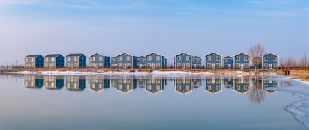 A Serene Sunset Scene: Brown and White Wooden Houses Gracefully Reflecting on the Body of Water