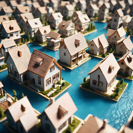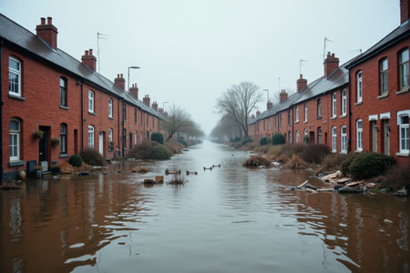 This image captures a surreal flooded village with houses partially submerged in water. The gloomy atmosphere and mist create a haunting yet captivating landscape.