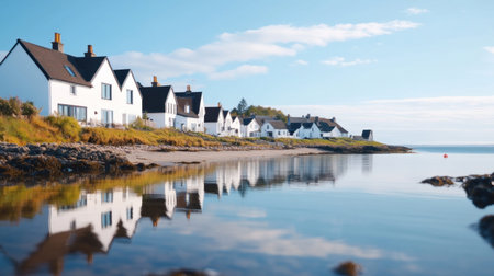 A picturesque scene of white houses along a shoreline, their reflections mirrored in the tranquil water under a bright sky.