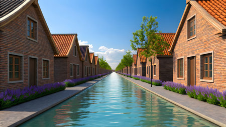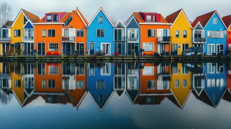 Colorful houses line a tranquil canal, featuring vivid reflections in the calm water. This picturesque scene captures urban beauty and harmonious architecture.