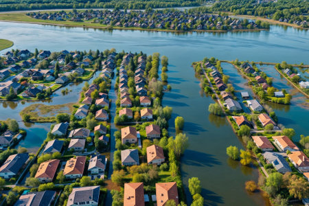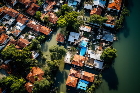 Aerial view of houses flooded with dirty water of a river. Buildings and cars submerged in water during an overflow of water. Generative AI.