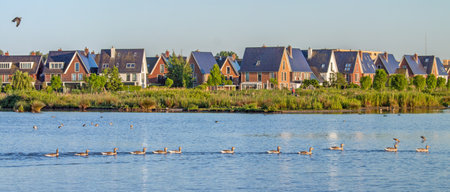 Row of modern brick houses along water with white swans in a family friendly suburban neighborhood in Houten in the Netherlands.