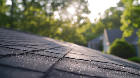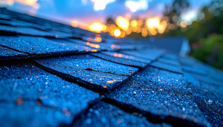 Close-up of wet asphalt roof shingles reflecting the warm glow of a sunset with a bokeh effect in the background.