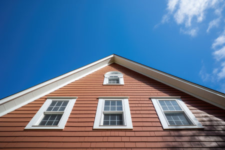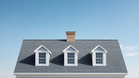 Captivating rooftop view showcasing a stylish home with three gabled windows and a chimney against a stunning blue sky, embodying charm and architectural beauty.