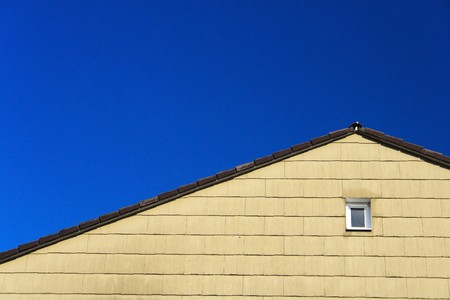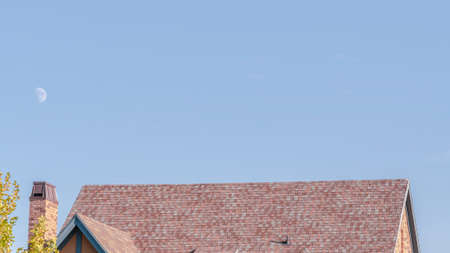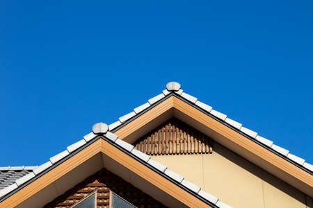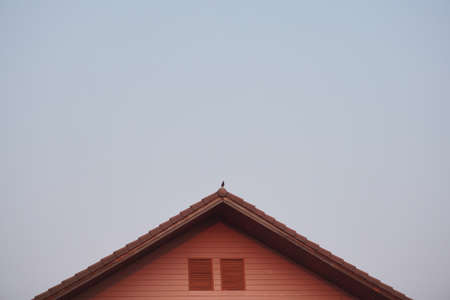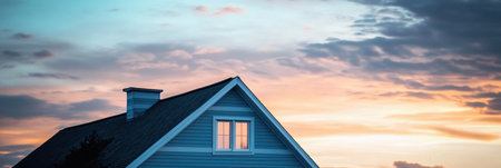 Tight shot of housetop during sunset with nice sunny blue background. Detailed building architectural abstract property closeup