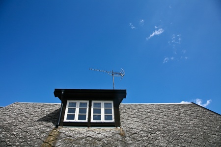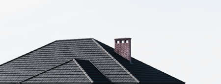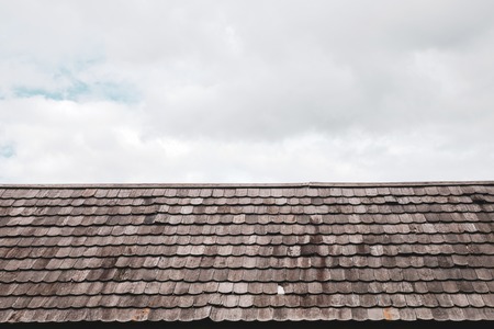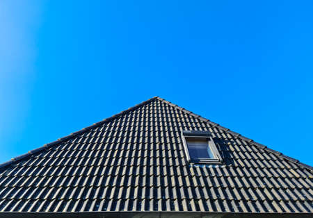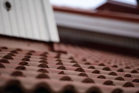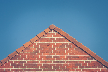 Close up of tiled roof on top of red brick house with blue sky in the background in vintage style.