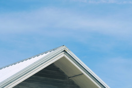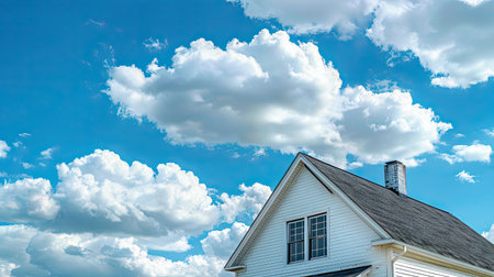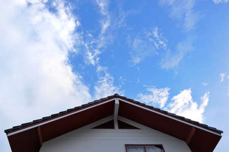 Looking up roof with home on blue sky and clouds, Beautiful nature blue sky with clouds, cloudscape concept. Space for text in template. Empty.