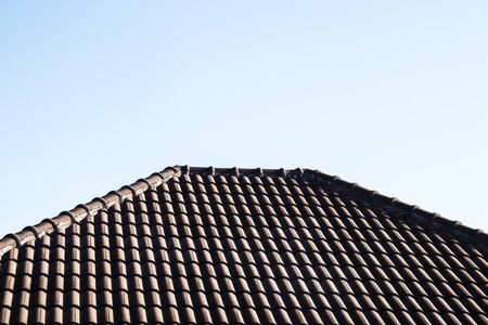 Brown tile roof under blue sky. The photo is divided on two part. One part is a roof made of clay tiles and the other is a blue sky. Brown surface of tile roof with natural color, texture and pattern