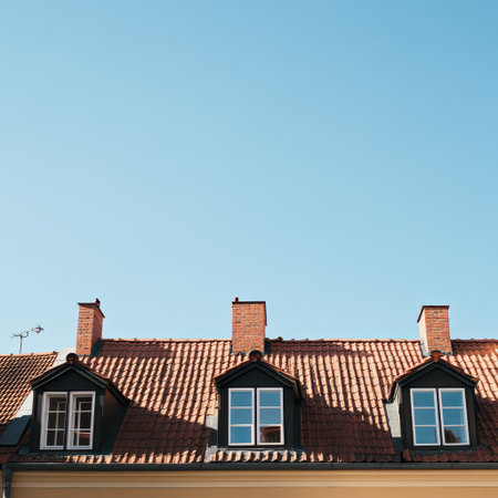 The image showcases a detailed view of a brick roof featuring multiple windows beneath a clear blue sky.