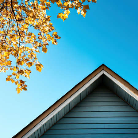 Bright yellow leaves hang above a slanted roof under a vibrant blue sky capturing the essence of autumn in a tranquil setting.
