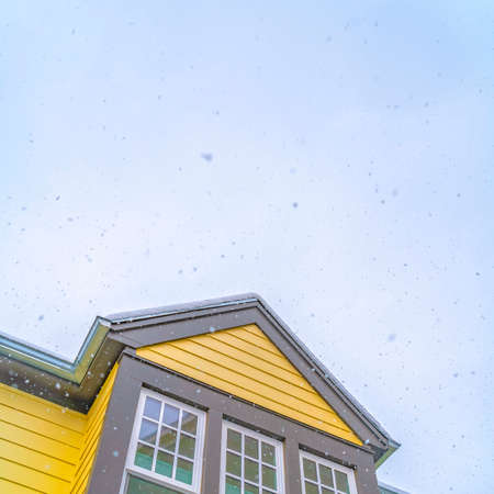 Square Exterior of a home in Daybreak Utah with cloudy sky background in winter. The yellow painted house has snow covered roof and reflective glass windows.