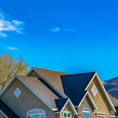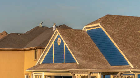 Pano Dark color roof of houses viewed against cloudless blue sky on a sunny day. Architectural details of homes with beige and blue exterior walls.
