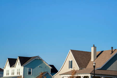 Side view of houses in a row with gable roofs at the suburbs of San Francisco, California. Small houses exterior with shingles on the roof against the clear blue sky.