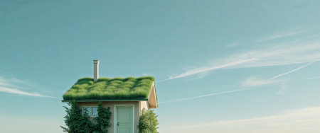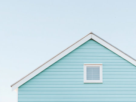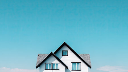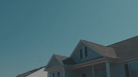 An exterior perspective showcases a residential building. The architectural design features pitched roof, windows, and exterior siding. The composition emphasizes the structure against a bright, clear blue sky. This image can be used for real estate, construction, or lifestyle projects.