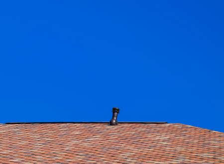 Ventilation on the roof. Roof from multi-colored bituminous shingles. Patterned bitumen shingles