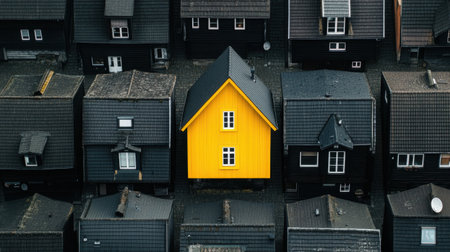 Vibrant yellow house contrasts sharply against black houses in a top-down view, symbolizing standing out from the crowd