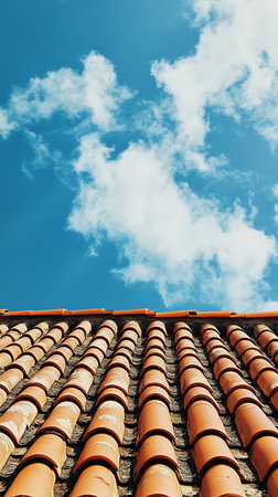 A worms-eye view shows rows of curved terracotta roof tiles beneath a vibrant blue sky filled with fluffy white clouds. The warm earthy tones contrast the clear sky.