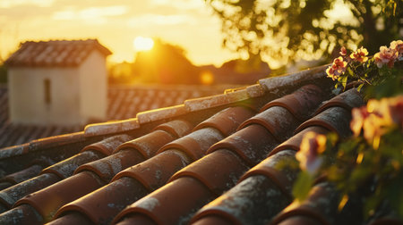 Captivating image of warm sunset light filtering over traditional roof tiles adorned with flowers, creating a serene garden atmosphere ideal for relaxation.