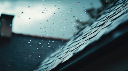 A slow-motion capture of raindrops falling from a rooftop against a dark, stormy sky.