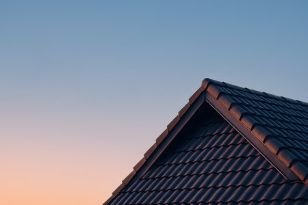 Detailed view of house roof shot during sunset with bright blue and orange sky in background close up angle view nature