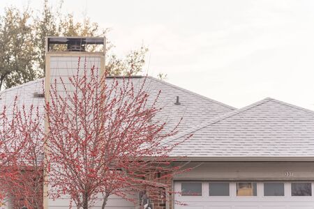 Bright red winter berry near chimney with frost on black shingle roof of residential house near Dallas, Texas, America. Light frosted roof surrounded by trees