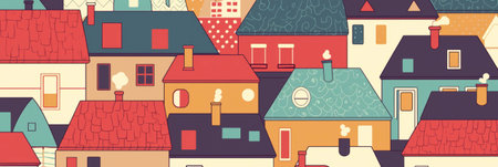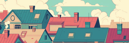 Colorful tiny houses with smoking chimneys create a charming neighborhood atmosphere