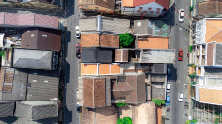 Aerial view of countryside a city view near the central market in the city Nonthaburi Province, Thailand, There is an empty space on top for the design.