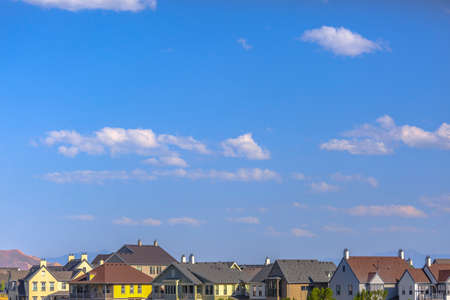 Panorama frame Exterior of upper storey of townhomes with blue sky background on a sunny day. The townhouses have pitched roofs, square windows, and blue and cream wall.