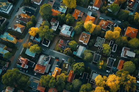 aerial view of suburban neighborhood with colorful rooftops, created with generative ai