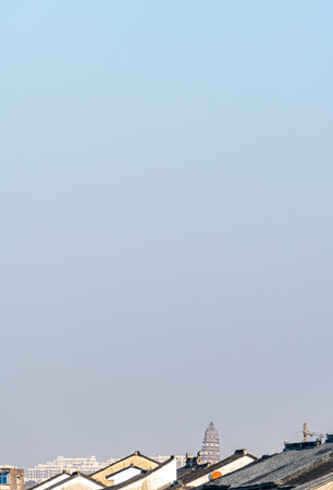 Pano Dark color roof of houses viewed against cloudless blue sky on a sunny day. Architectural details of homes with beige and blue exterior walls.