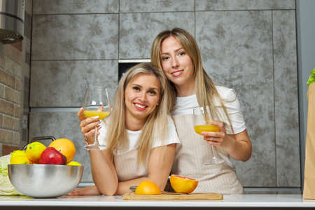 Two cute blonde women prepare juice from freshly squeezed fruits in a modern kitchen, chat sweetly, smile, they really like to spend time together