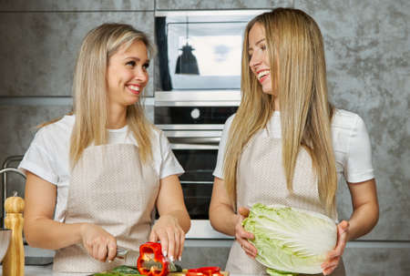 Two cute blonde women cook together from fresh vegetables and smile gently at each other in a modern kitchen
