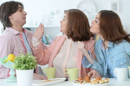 Family of three spending time together at dinner table with cookies and tea
