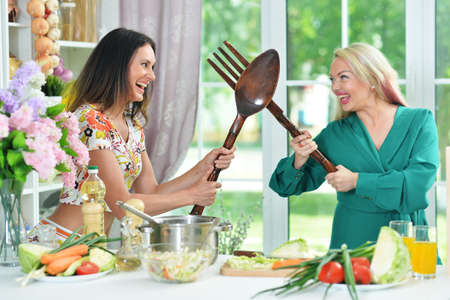 Two beautiful young women cooking together in kitchen