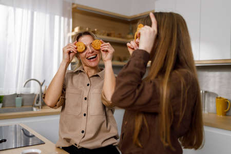 Joyful mother and her adult daughter are having fun in the kitchen during coffee time covering their eyes with cookies