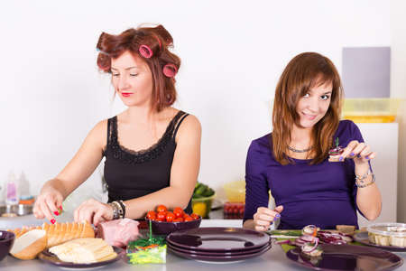 Two young pretty woman housewife cooking with curlers on hair