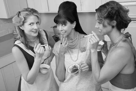 Three middle-aged woman smoke in a retro-style tea party