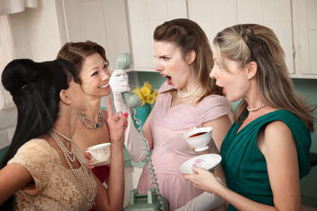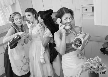 Woman on phone while friends give young woman cigarette and alcohol in a retro styled kitchen scene