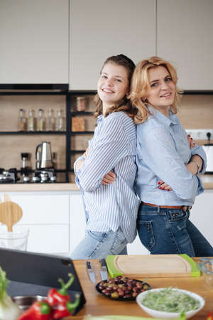 Mom and daughter cooking together in the kitchen. They use vegetables for cooking in a good mood, happy to be together