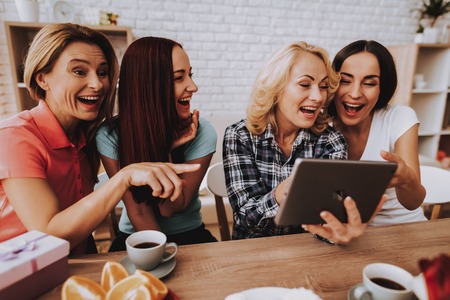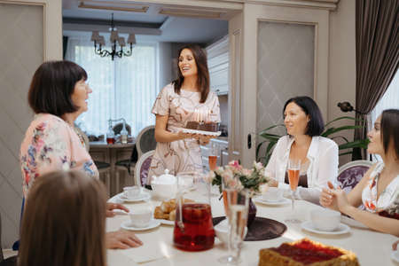 Different generations of women serving tea together while laughing, chatting and sitting at the table at home. Family reunion, mom and daughters